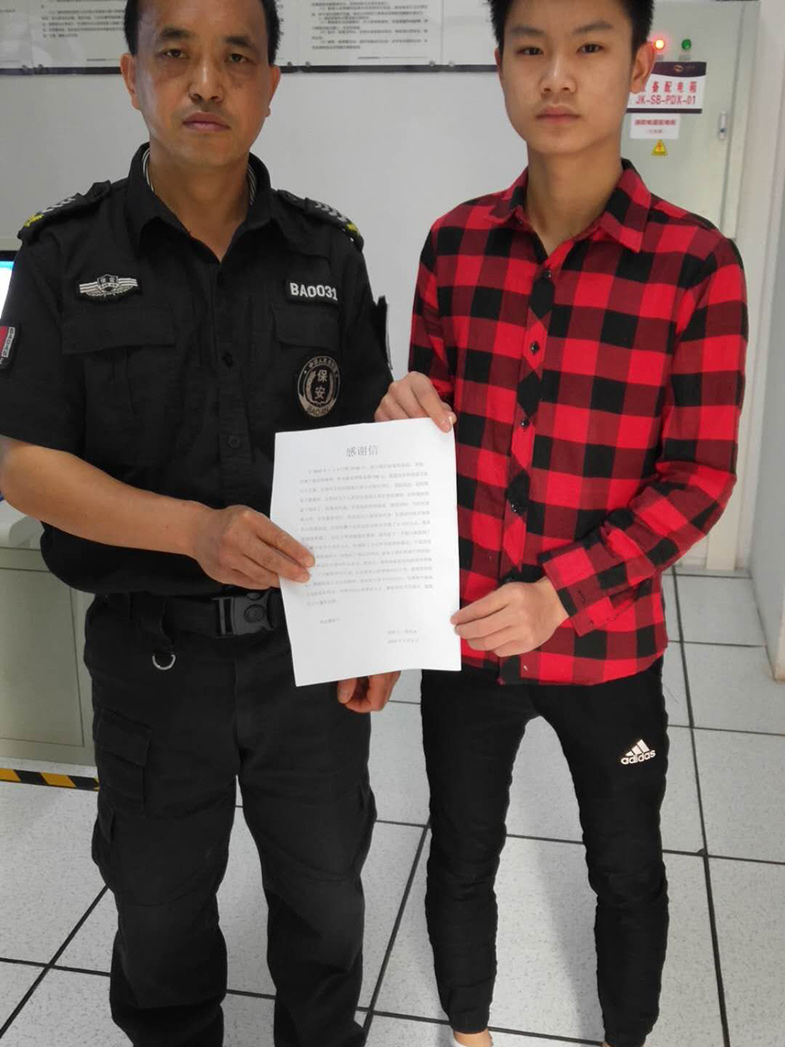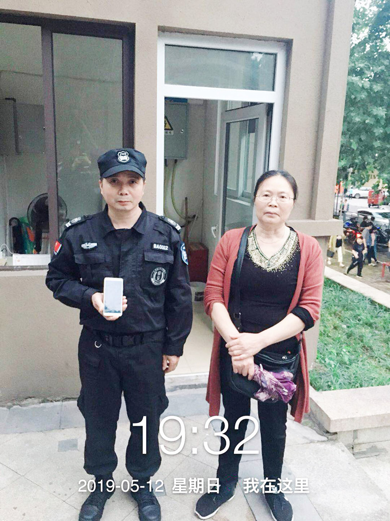 2、2019年5月8日上午11點08分,陽光一百南區(qū)中威戰(zhàn)士謝金云正在執(zhí)勤時,拾到一部蘋果手機(jī),擔(dān)心失主著急,謝金云立即上報隊長并詢問R區(qū)廣場上的路人是否有人遺失了東西,正在謝金云詢問的過程中,他接到了失主程女士用其他手機(jī)撥過來的電話,謝金云這顆為失主焦慮不安的心才得以放下。謝金云告訴失主程女士讓她前往陽光一百南區(qū)客服中心領(lǐng)取手機(jī),程女士連聲感謝。