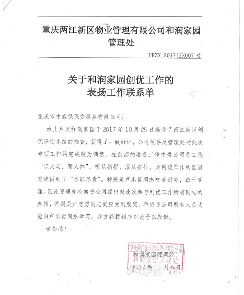 2017年10月25日,和潤家園小區(qū)接受了兩江新區(qū)創(chuàng)優(yōu)評定的檢查,獲得了一致好評,來自中威保的戰(zhàn)士們用他們?nèi)娜鉃榭蛻舴?wù)的行動,贏得了甲方領(lǐng)導(dǎo)及管理處的高度認(rèn)可。