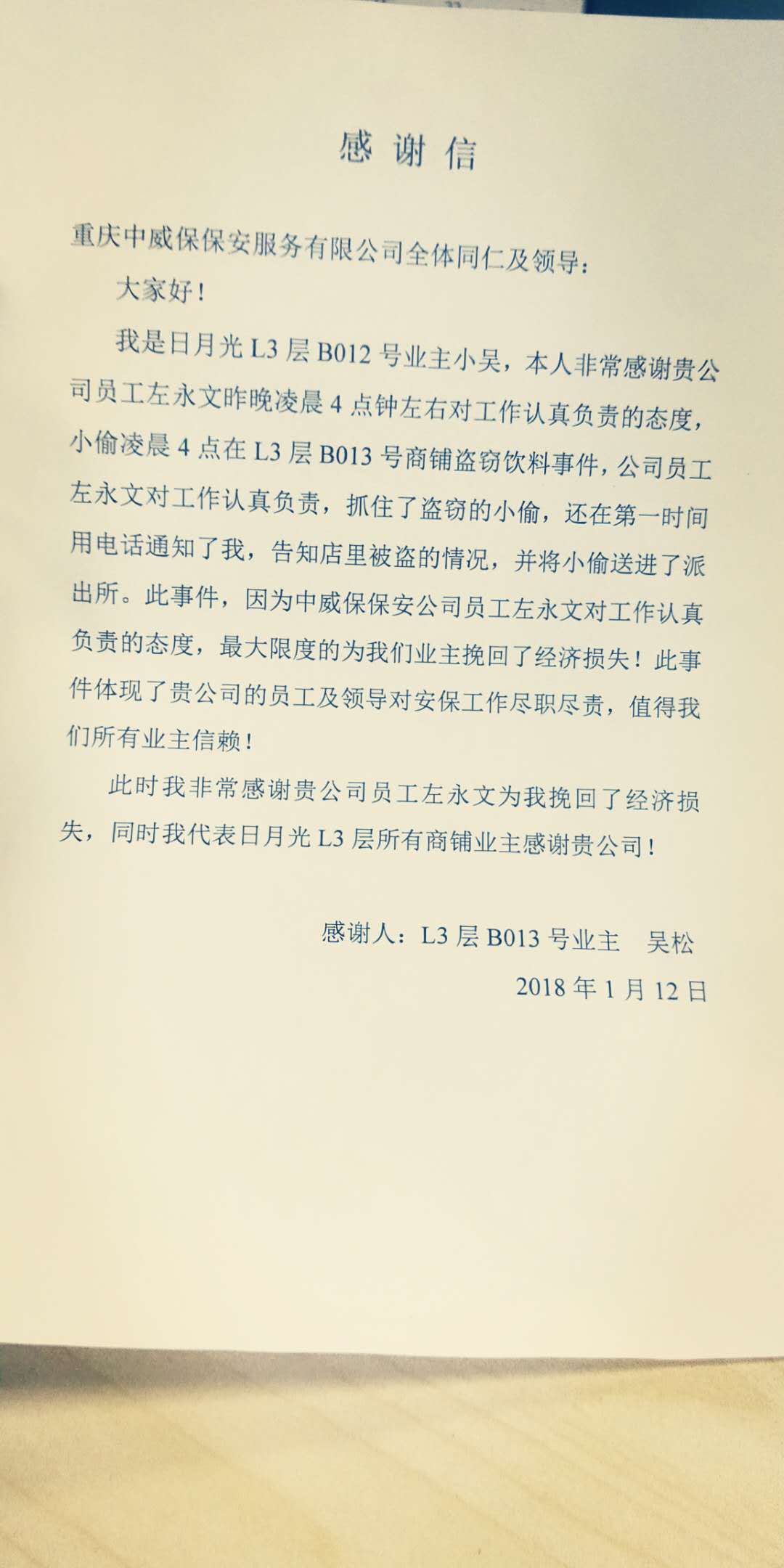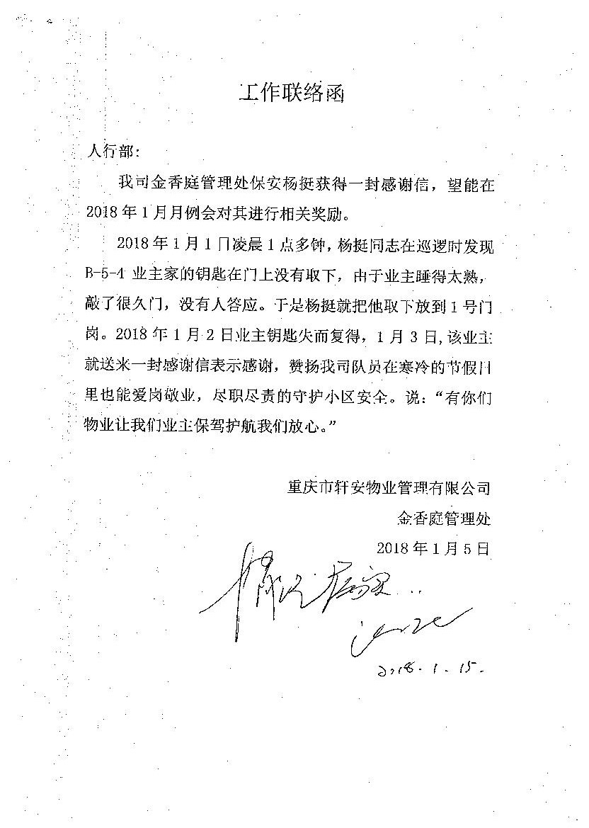 日月光保安認真負責獲表揚信